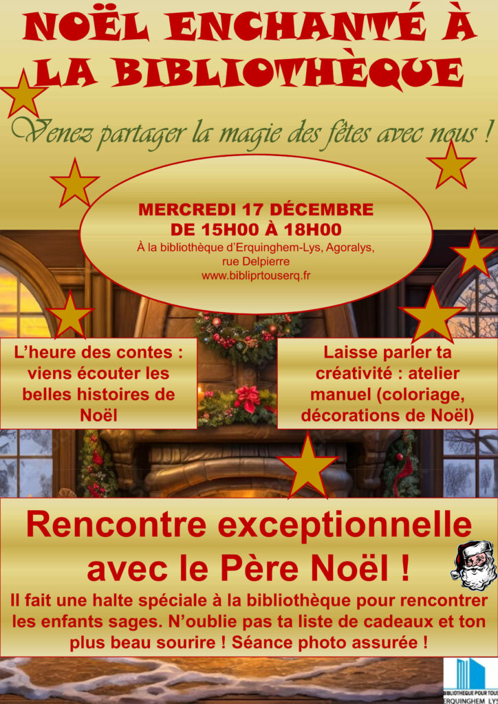 Bientôt les fêtes ! En attendant NOËL, les bibliothécaires invitent les enfants pour des histoires dans l’esprit de Noël, le mercredi 17 Décembre 2025, de 15h à 18h, à la Bibliothèque pour Tous, Centre Agoralys, 120 rue Delpierre, 59193 Erquinghem-lys,